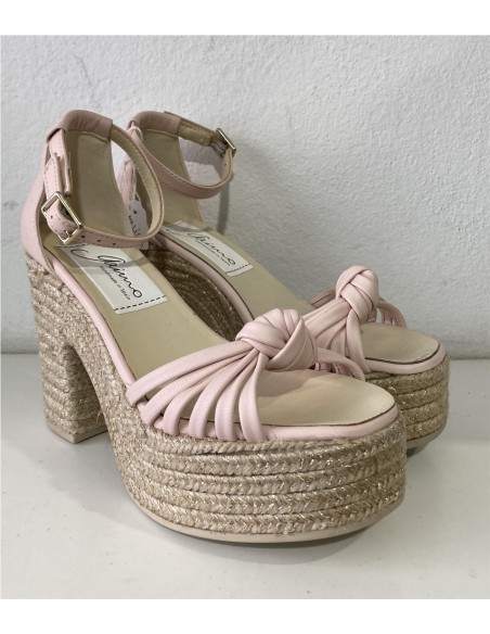 Alpargata de piel estilo sandalia con detalle de multi tiras entrelazadas en un nudo y talón cerrado con pulsera con hebilla al tobillo. Forro y plantillas acolchadas de piel con tacón ancho de yute ecológico de 10,5 cm de altura y plataforma de 3,5 cm.
