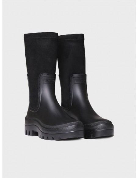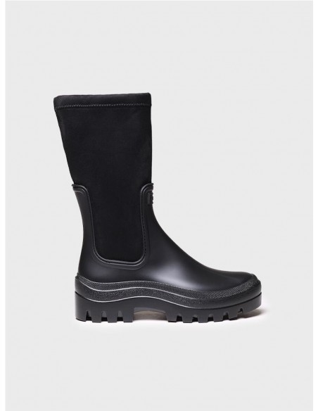 Bota de agua para mujer elaborada en goma y licra con efecto ante monocolor. La suela es de tacón bajo, con un total de 5 cm de altura. La base está hecha de goma antideslizante. La plantilla interior está forrada en tejido para mayor confort.