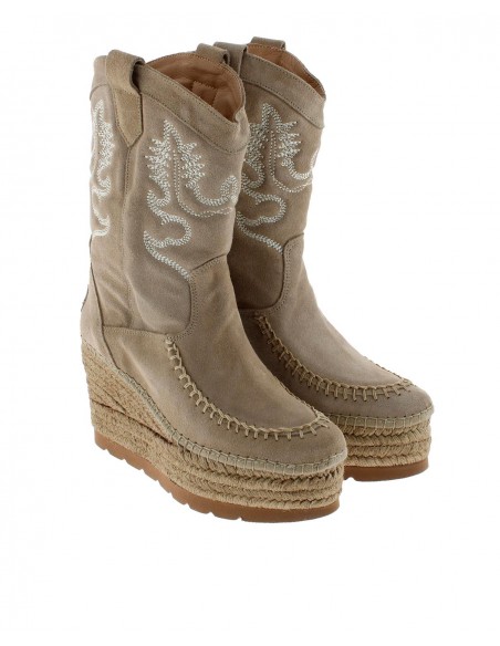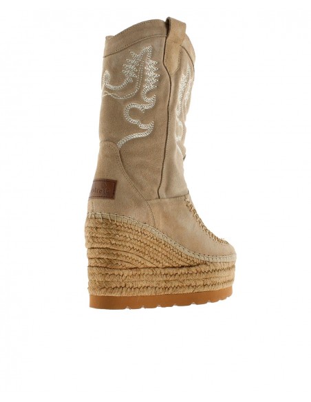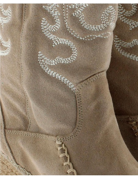 Bota alta tipo Cowboy de serraje, con bordados en la caña. Tiene incorporada plantilla de microfibra transpirable y anti-bacteriana. Piso de YUTE HIDRÓFUGO. Cuña de 9 cm de altura con plataforma de 3 cm.