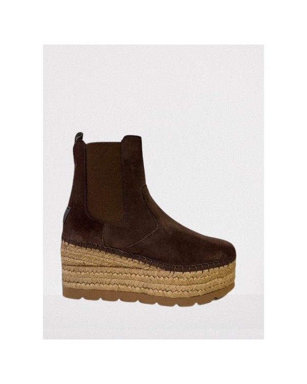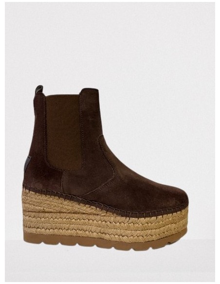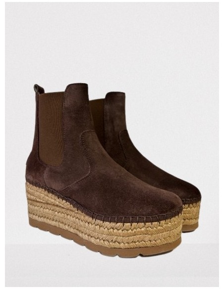 Botín Chelsea elaborado en piel de serraje con cuña de yute natural con tratamiento hidrófugo que resiste el agua. Lleva plantilla de microfibra transpirable y antibacteriana. Tiene una altura total de 7 cm incluyendo una plataforma de 4 cm. Suela antideslizante. Es un fondo de armario perfecto para tus looks de esta temporada.