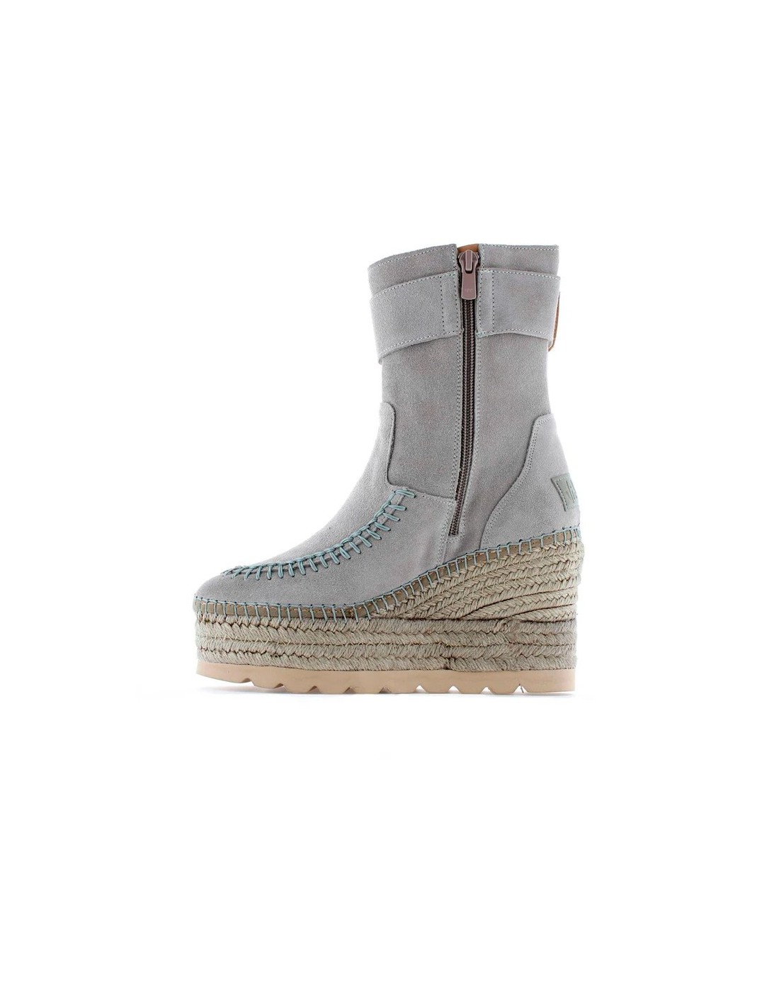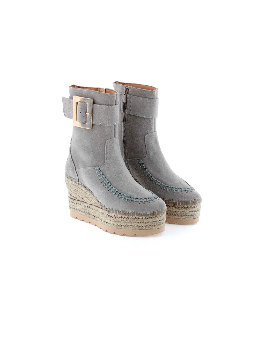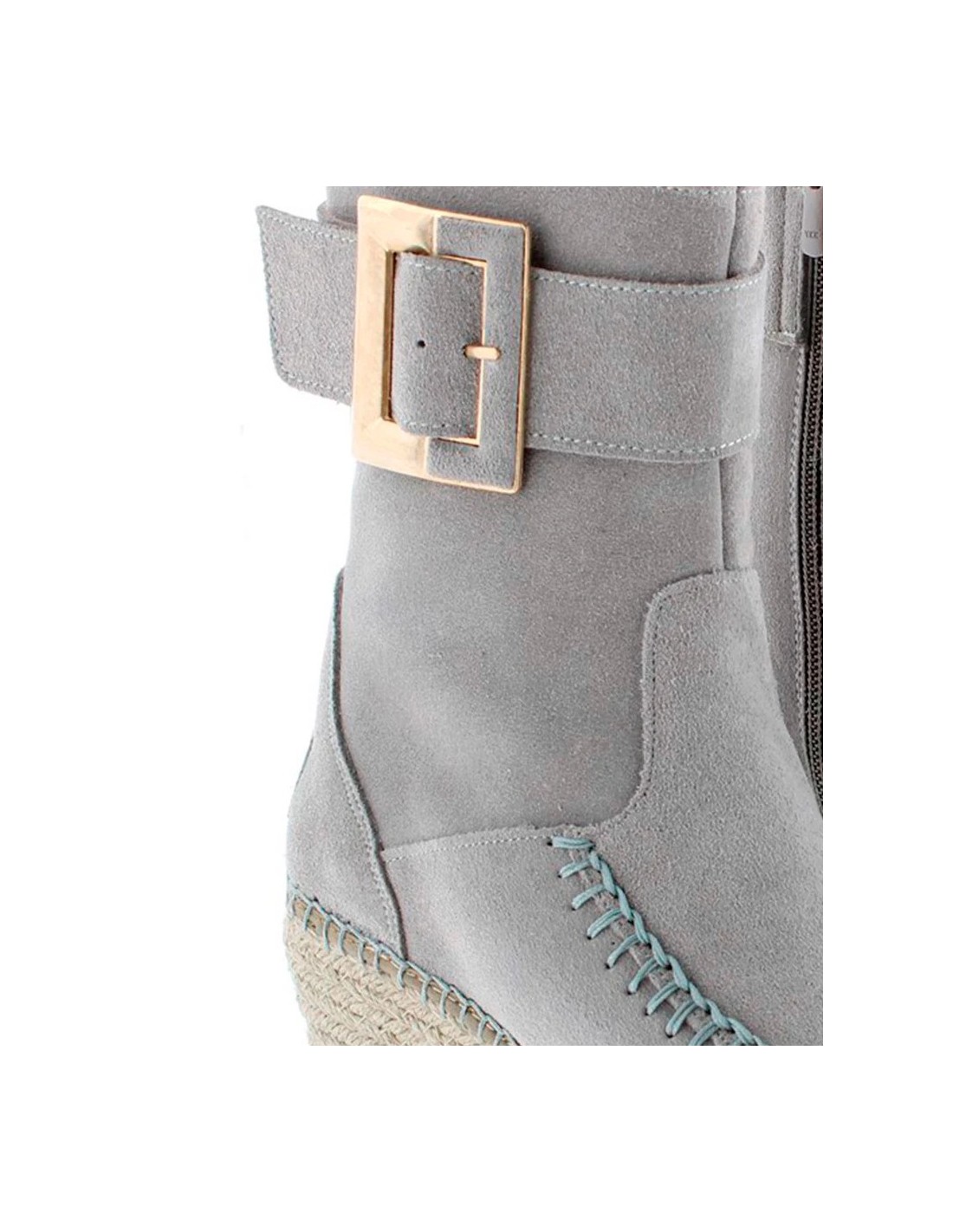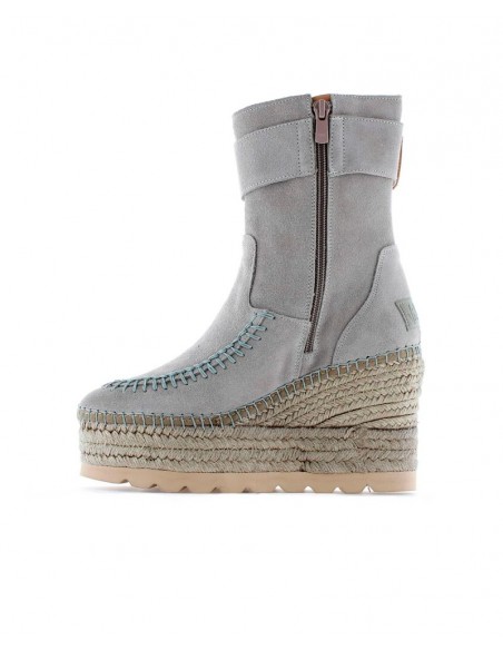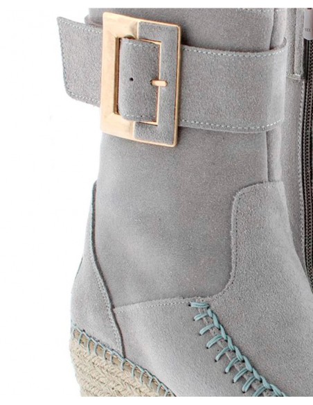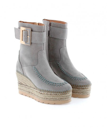 Botín elaborado en piel de serraje con detalle de hebilla en el lateral exterior de la caña y cierre mediante cremallera en el lateral interior. Tiene la cuña de yute natural con tratamiento hidrófugo que le hace resistente al agua. Lleva plantilla acolchada de microfibra transpirable y antibacteriana. Tiene una altura total de 9,5 cm. incluyendo 4 cm de plataforma. Lleva suela antideslizante. Es un fondo de armario ideal con un toque chic para todos tus looks de otoño invierno.