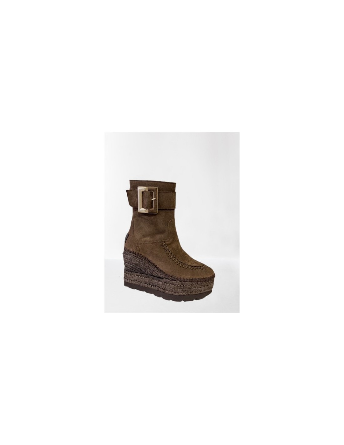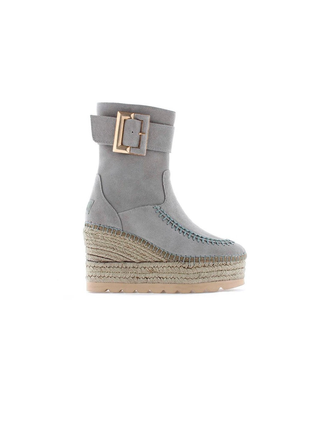 Botín elaborado en piel de serraje con detalle de hebilla en el lateral exterior de la caña y cierre mediante cremallera en el lateral interior. Tiene la cuña de yute natural con tratamiento hidrófugo que le hace resistente al agua. Lleva plantilla acolchada de microfibra transpirable y antibacteriana. Tiene una altura total de 9,5 cm. incluyendo 4 cm de plataforma. Lleva suela antideslizante. Es un fondo de armario ideal con un toque chic para todos tus looks de otoño invierno.