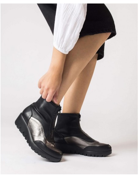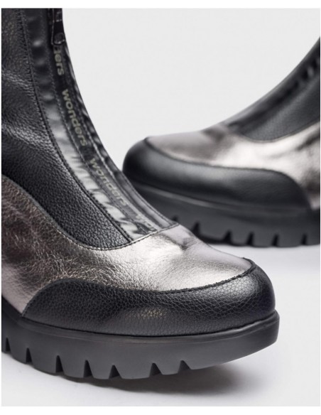 Botín de mujer en piel lisa en color negro y metalizada junto con un material elástico en la caña. Se distingue por su cierre frontal mediante cremallera con detalle del logotipo Wonders, que añade un toque único. La cuña desarrollada con la tecnología WondersFly ™, garantiza ligereza y comodidad, además cuenta con una plantilla MemoryGel extraíble, que brinda un extra de confort. Disfruta de la calidad y la innovación que ofrece Wonders, y prepárate para despegar con la sensación #YESWEFLY.