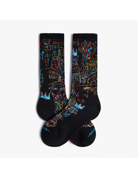 CALCETINES UNISEX JIMMY LION DE MEDIA CAÑA INSPIRADOS EN EL ARTISTA BASQUIAT Y SU OBRA SOBRE FONDO NEGRO. ESTAN CONFECCIONADOS CON 70% ALGODON PEINADO ORGANICO, 27% POLIAMIDA Y 3% ELASTANO.