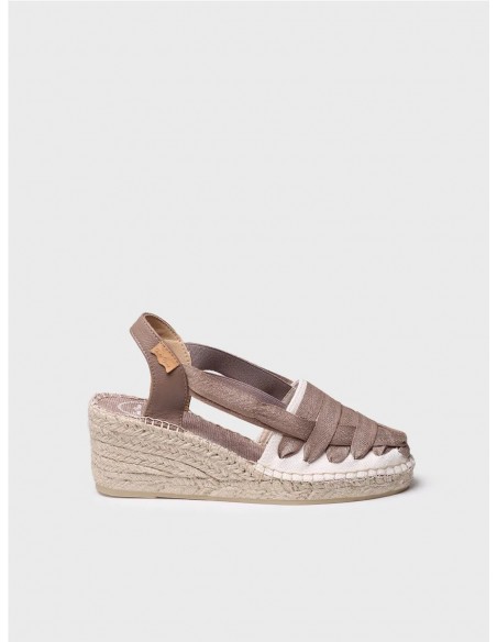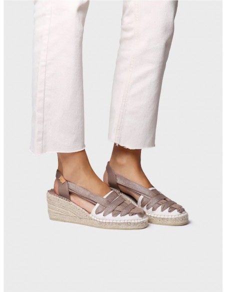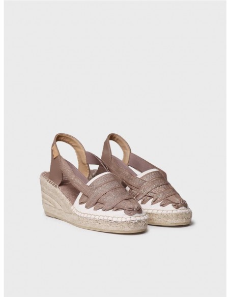 Alpargata elaborada en tejido de algodón de color crudo, con cintas de color contrastado.Tiene una altura total de 6 cm, de los cuales 4 cm corresponden al tacón y 2 cm a la suela. La cuña es de yute con la base de goma antideslizante. La plantilla interior está acolchada y forrada en tejido de color contrastado. La unión de la tela y la suela está cosida a mano con hilo de de alta calidad, y sus tiras laterales tienen un elástico interior para una óptima sujeción al pie.