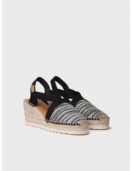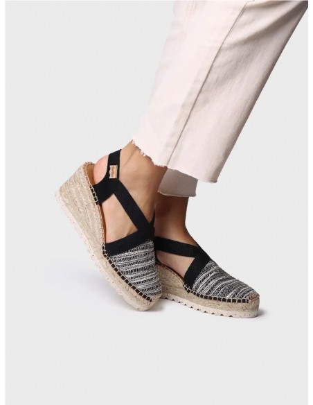 Alpargata de mujer elaborada en tejido multicolor y serraje. La cuña de yute tiene una altura total de 6 cm, de los cuales 4 cm forman parte del tacón y 2 cm de la plataforma. La base de la suela es de goma antideslizante. La plantilla interior está forrada en piel. Cuenta con dos bandas elásticas para una perfecta fijación al pie.