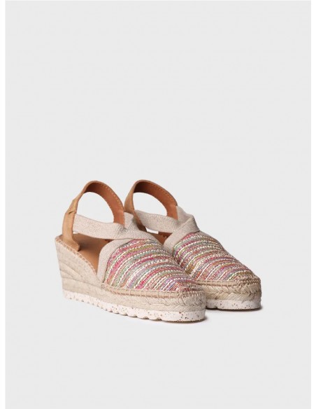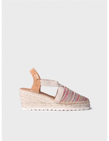 Alpargata de mujer elaborada en tejido multicolor y serraje. La cuña de yute tiene una altura total de 6 cm, de los cuales 4 cm forman parte del tacón y 2 cm de la plataforma. La base de la suela es de goma antideslizante. La plantilla interior está forrada en piel. Cuenta con dos bandas elásticas para una perfecta fijación al pie.