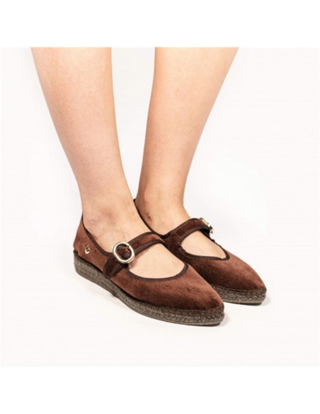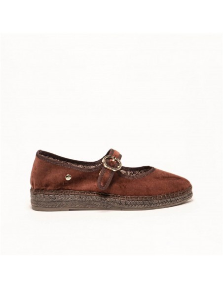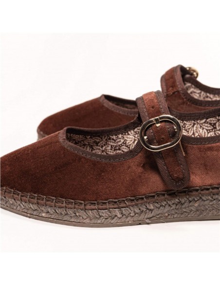 Bailarina con hebilla elaborada en terciopelo. Plantilla forrada y acolchada. Cosido a mano. Suela de yute al tono con 2,5 cm de altura.