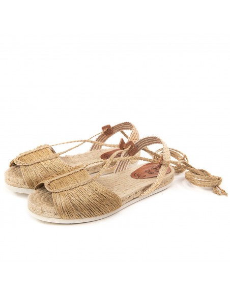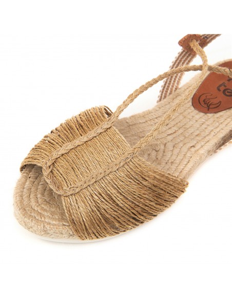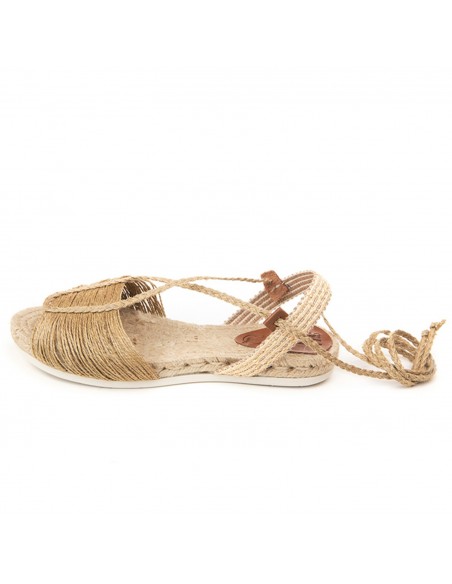 Alpargata estilo sandalia plana con suela de trenza en yute natural y suela de goma antideslizante. Fabricada en yute color natural y con tiras de yute del mismo color para atar en el tobillo. Tiene una altura de 1,5 cm. Muy estilosa y fresca para tus looks de verano.