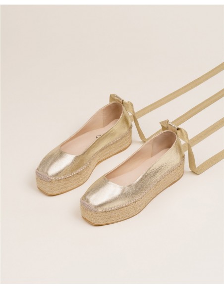 Alpargata de mujer estilo bailarina en piel grabada con cintas anudadas al tobillo con forro y plantillas acolchadas de piel y plataforma de yute ecológico de 4 cm de altura. Diseñadas y fabricadas artesanalmente en España, son la combinación perfecta entre diseño impecable y comodidad, las sentirás como una segunda piel y podrán combinar con cualquiera de tus looks veraniegos.