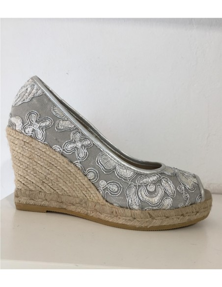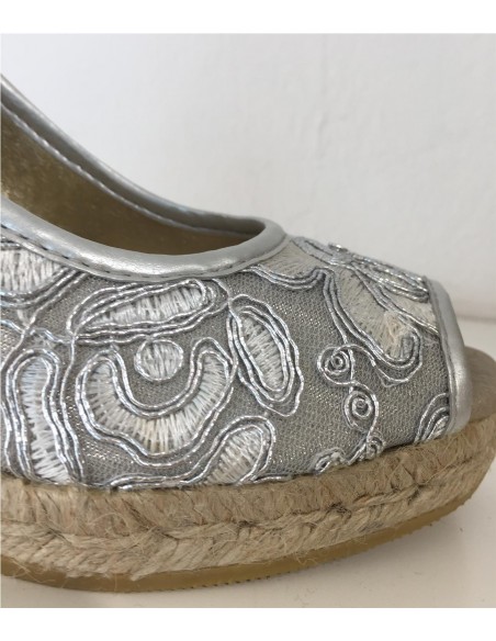 Alpargata tipo salón peep toe elaborado con tejido plata bordado. Plantilla forrada y acolchada. Altura de 9 cm.