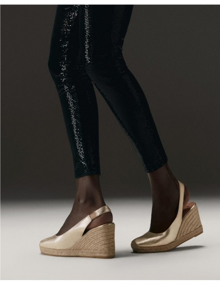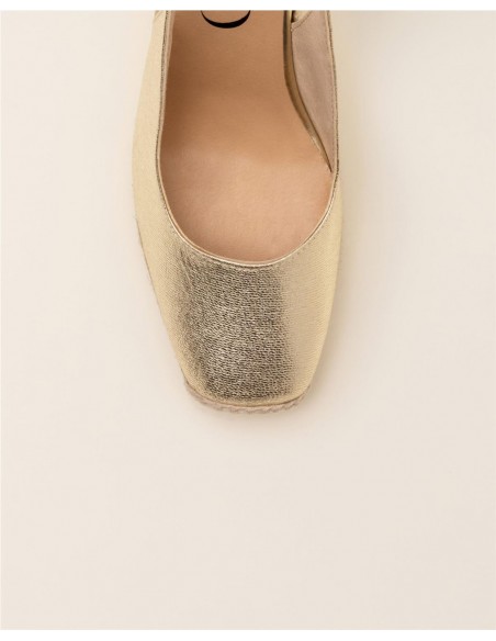 Salón en piel color oro, destalonado con elástico y punta cuadrada. Forro y plantillas acolchadas de piel con cuña de 8,5 cm de altura y plataforma de 2 cm. Es un modelo atemporal muy cómodo y combinable.