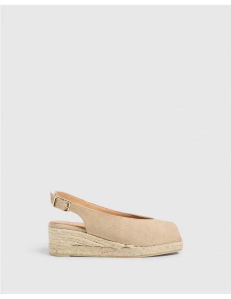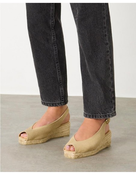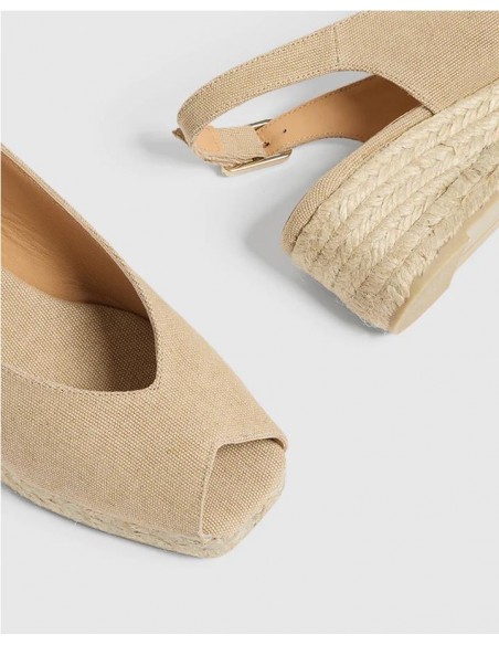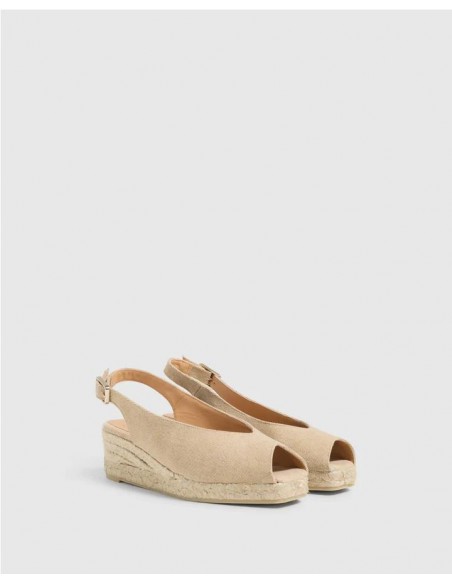 Alpargata tipo salón clásico con puntera abierta y hebilla al lateral. Cuña en yute y talón abierto. Altura total de 5 cm incluyendo 2 cm de base. Es un modelo clásico y atemporal de Castañer.