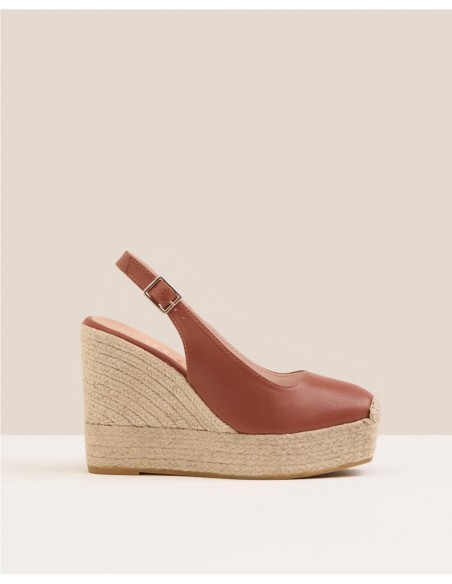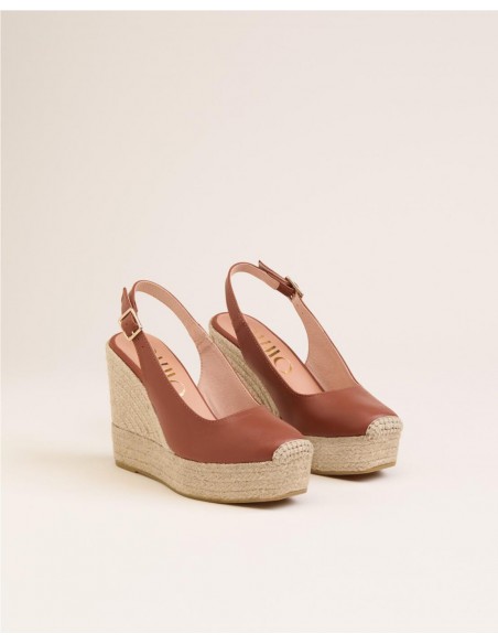 Salón de mujer en piel napa súper suave destalonado con punta cuadrada y cierre mediante hebilla lateral. Forro y plantillas acolchadas de piel con cuña de yute ecológico de 11,5 cm de altura y plataforma de 3,5 cm. Son un fondo de armario ideal para ganar altura y completar tu look con un toque final llamativo y muy cómodo.