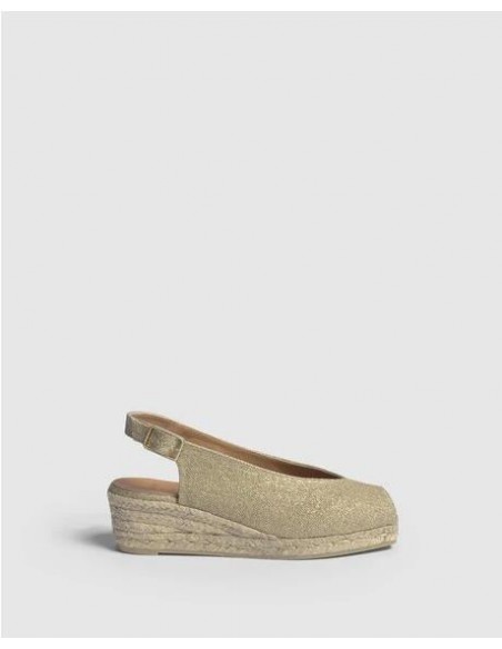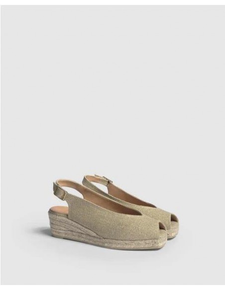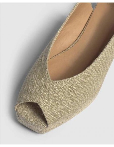ALPARGATA CON CUÑA OPEN TOE ELABORADA EN LINO METALIZADO. TALÓN ABIERTO Y PUNTA CUADRADA. SUELA DE CAUCHO VULCANIZADO COLOR NATURAL. ALTURA DE 5 CM, CUÑA DE 3 CM Y PLATAFORMA DE 2 CM