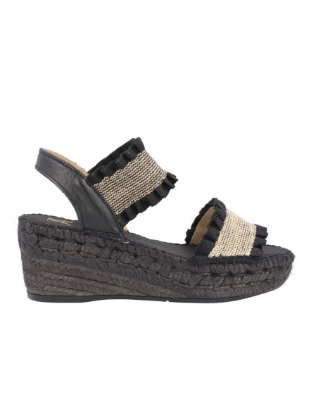 Alpargata tipo sandalia confeccionada con dos bandas adornadas con volantes. La de atrás es elástica, por lo que se ajusta perfectamente al pie. Además tiene la plantilla forrada y acolchada, fabricada en microfibra natural transpirable. Tiene una cuña de 7 cm y una plataforma delantera de 4 cm. Ideal para caminar y vestir todos los días de verano.
