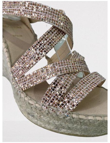 Sandalia glitter elaborada con tiras que cubren el empeine y se ajuntan con hebilla al tobillo. Muy combinable, ideal para tus looks de verano. Plantilla forrada en piel acolchada. Suela con altura de 10 cm incluyendo 3 cm de plataforma.
