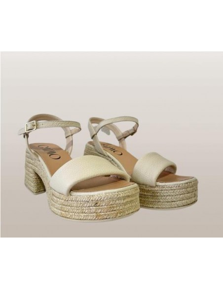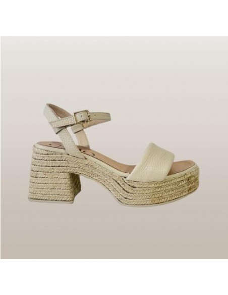 Alpargata de piel de corte abierto con punta cuadrada y talón con cierre mediante hebilla lateral. Forro y plantillas acolchadas de piel con tacón ancho de yute ecológico de 8 cm de altura y plataforma de 3,5 cm. Muy cómoda y combinable.