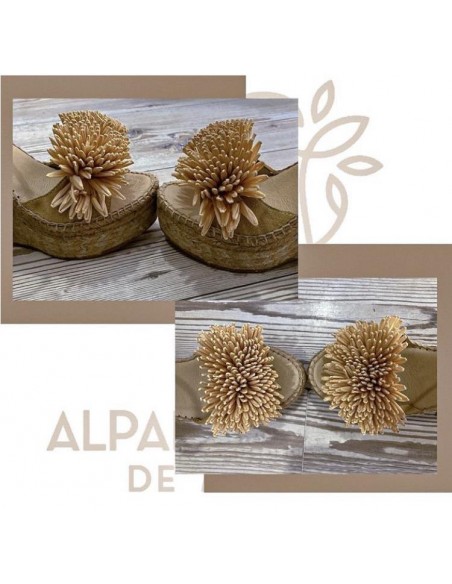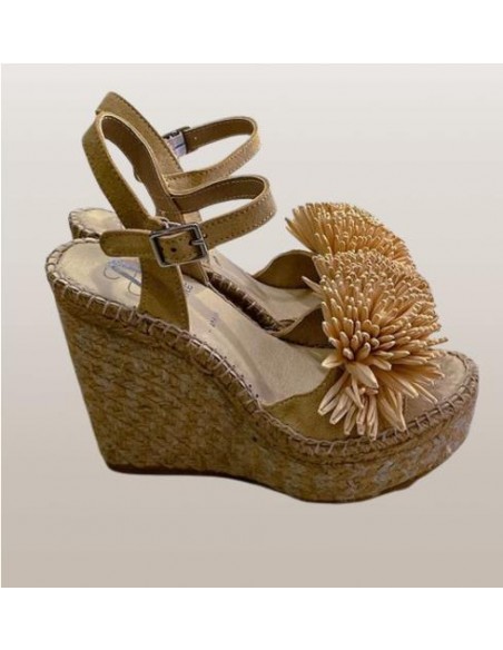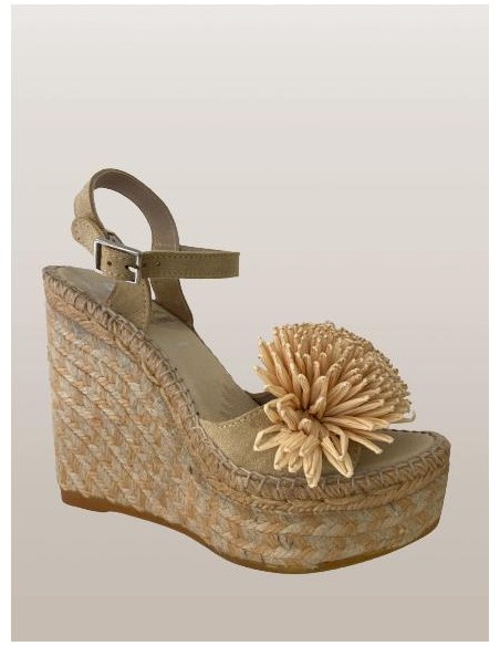 Sandalia de piel serraje con pompon en la tira delantera y sujección con pulsera con hebilla. Plantilla forrada y acolchada. Suela de yute combinado en dos tonos. Altura total de 12 cm con 4 cm de plataforma. Muy cómoda y combinable. Da un toque espectacular a tu look de verano.