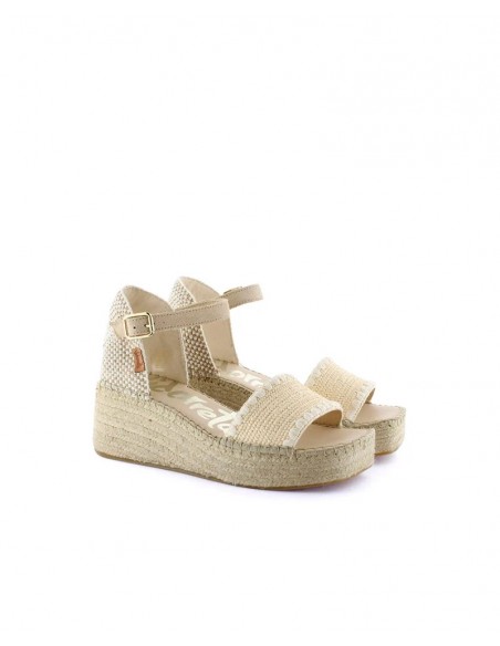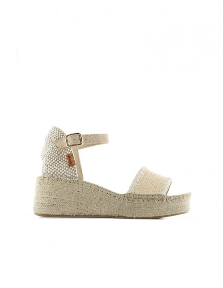 Sandalia con tira delantera elaborada en rafia y sujección al tobillo con pulsera. Plantilla de microfibra transpirable y antibacteriana. Tiene cuña de yute natural con una altura total de 6 cm incluyendo 3 cm de base. Ideal para todos tus looks de verano sin perder la comodidad.