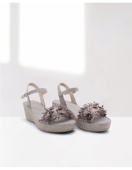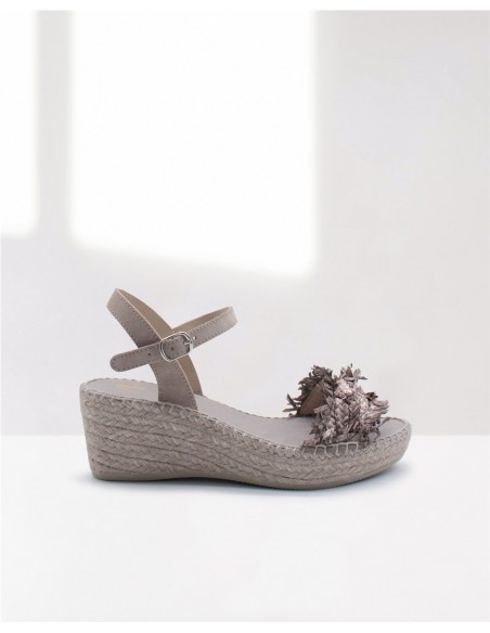 Sandalias inspiradas en las islas griegas, con sujección al tobillo mediante tira elaboradas en piel y que llevan en la parte delantera una pala de rafia natural entrelazada elaborada con palma de raphia africana que las hace muy distintivas, y que recuerda a su origen vegetal. La suela de yute natural tiene una altura total de 6 cm, incluyendo 2,5 cm de base. Es una cuña media perfecta si buscas un calzado cómodo para todos tus eventos.