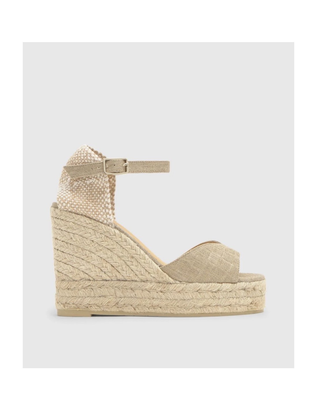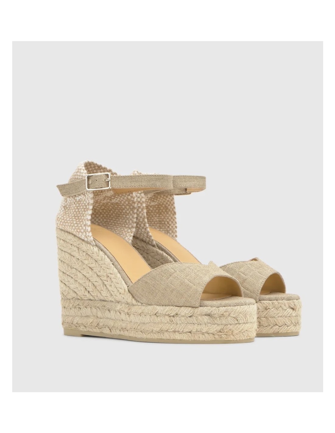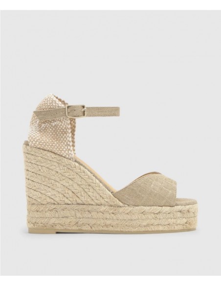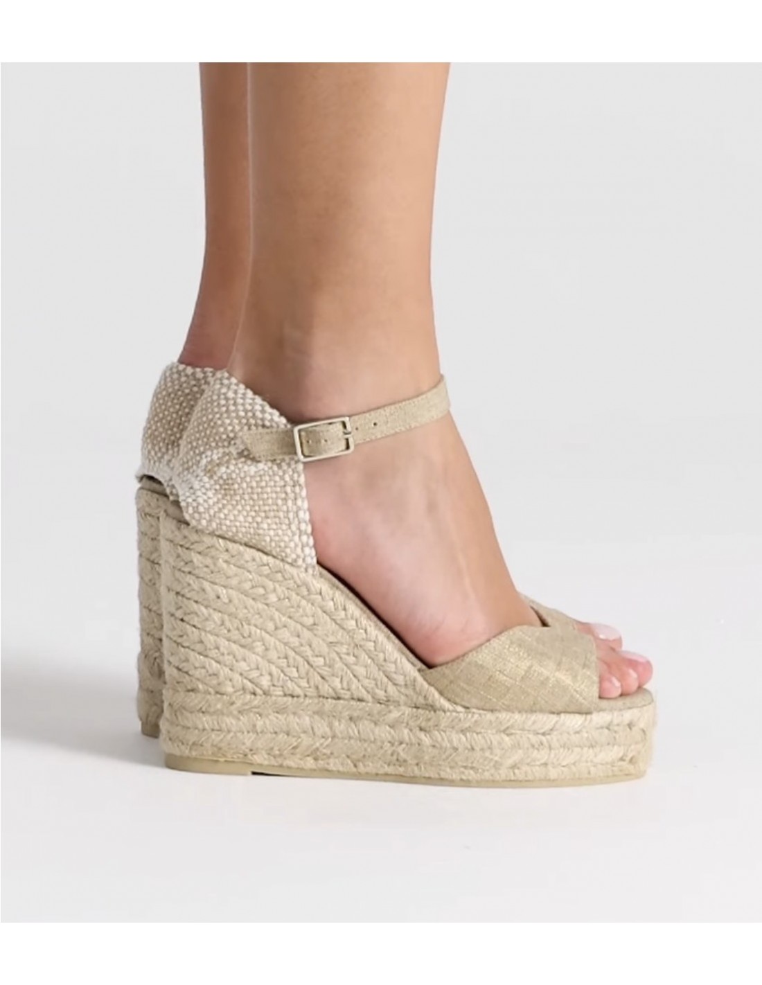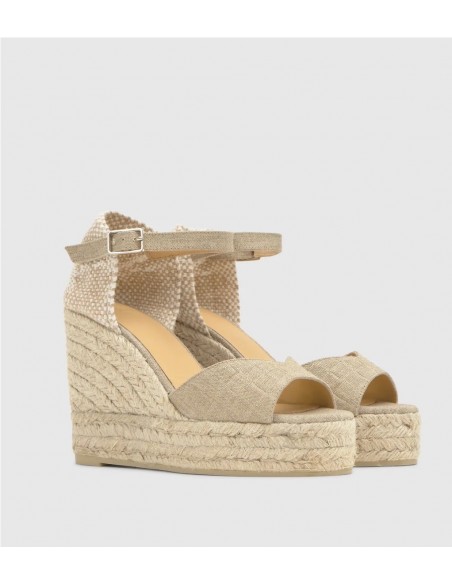 Sandalia en lino metalizado con efecto acolchado, cierre de hebilla, plantilla acolchada y escote en V. Cuña de yute y lurex con una altura total de 11cm incluyendo 3 cm de la doble plataforma. Ideal para realzar tus looks.