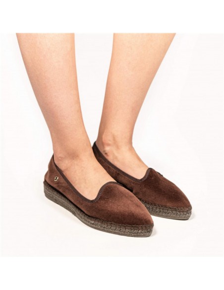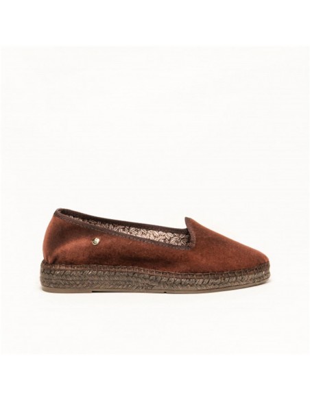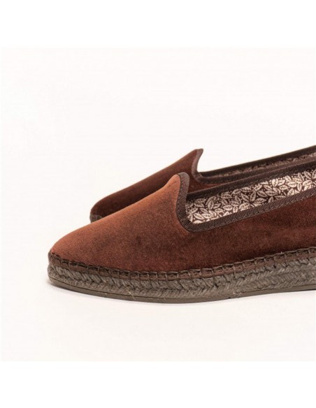 Slippers veneciano elaborado en terciopelo. Plantilla forrada y acolchada. Cosido a mano. La suela es de esparto con altura de 2.5 cm.