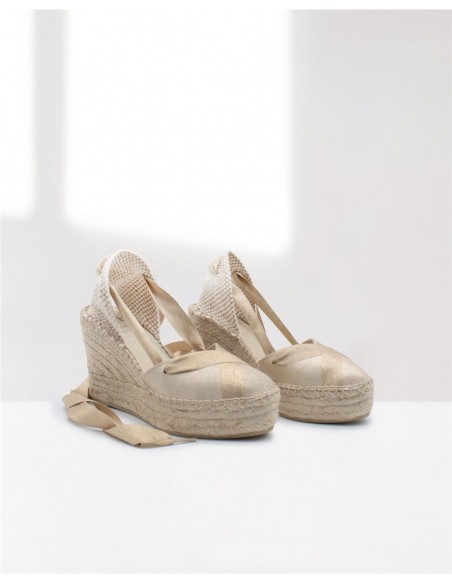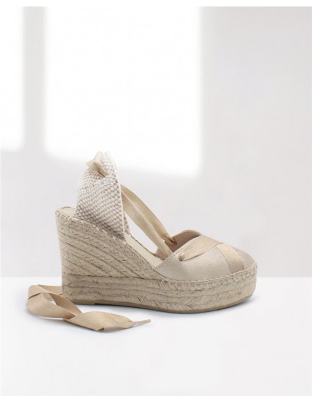 Valenciana de cintas en piel de serraje con cintas cruzadas que salen desde la punta y estilizan el pie. Plantilla forrada y acolchada. Altura total 10 cm con 3,5 cm de plataforma.