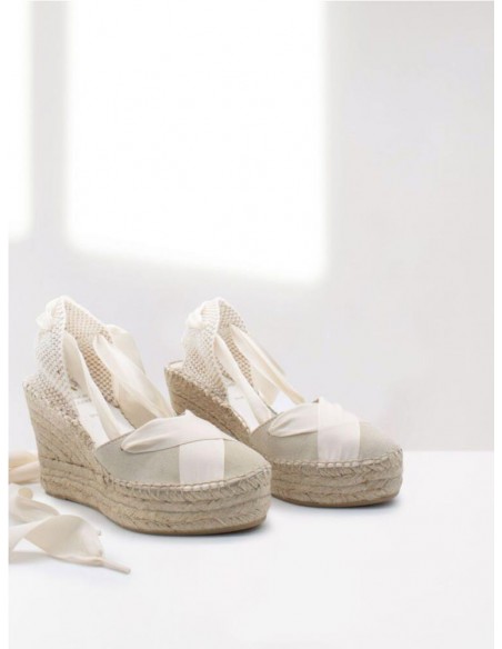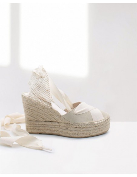 Valenciana de cintas en piel de serraje con cintas cruzadas que salen desde la punta y estilizan el pie. Plantilla forrada y acolchada. Altura total 10 cm con 3,5 cm de plataforma.