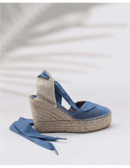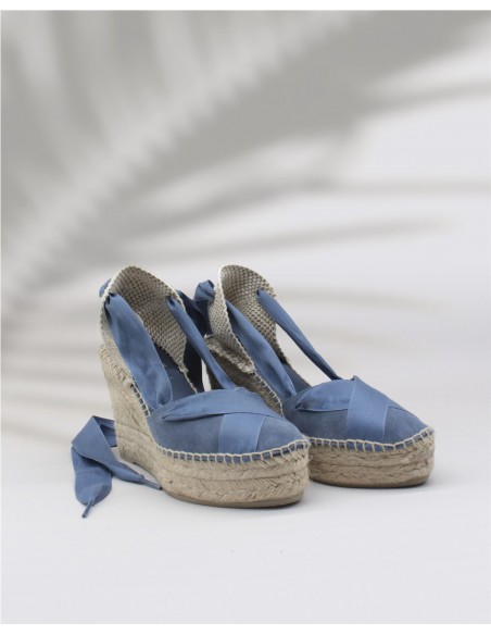 Valenciana de cintas en piel de serraje con cintas cruzadas que salen desde la punta y estilizan el pie. Plantilla forrada y acolchada. Altura total 10 cm con 3,5 cm de plataforma.