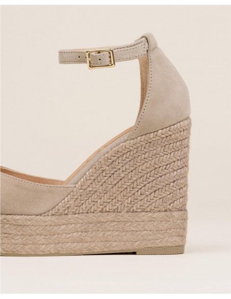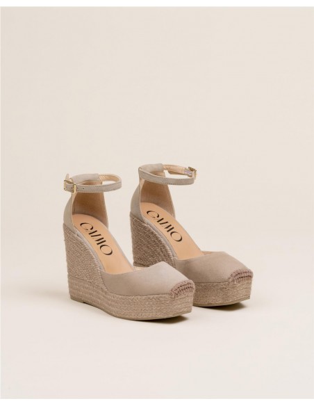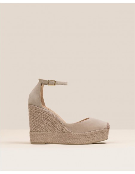Alpargata de piel de ante de corte cerrado con punta cuadrada y talón con cierre mediante pulsera con hebilla. Forro y plantillas acolchadas de piel. Suela del mismo color de yute ecológico de 12,5 cm de altura y plataforma de 4 cm.