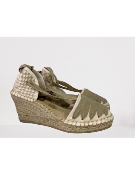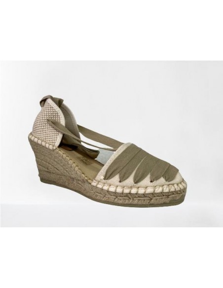 Valenciana en tejido con encintado de algodón. Plantilla forrada y muy acolchada, muy confortable y cómoda. Suela con altura de 7 cm incluídos 2 cm de base.