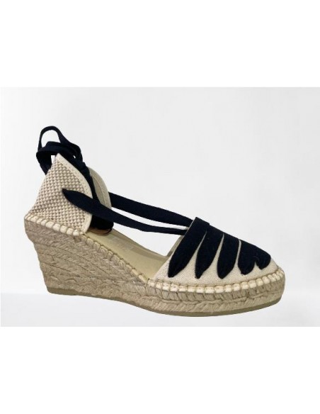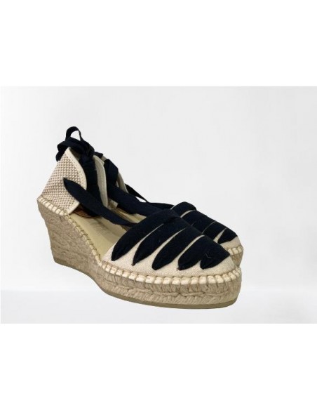 Valenciana en tejido con encintado de algodón. Plantilla forrada y muy acolchada, muy confortable y cómoda. Suela con altura de 7 cm incluídos 2 cm de base.