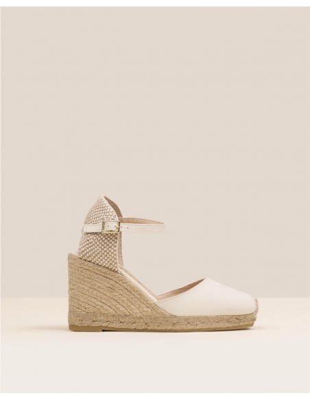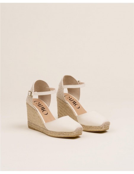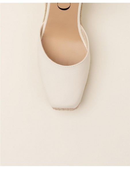 Alpargata de corte cerrado con punta cuadrada y talonera con cierre mediante hebilla al tobillo. Forro y plantillas acolchadas de piel con cuña de yute ecológico de 8,5 cm de altura y plataforma de 2 cm.