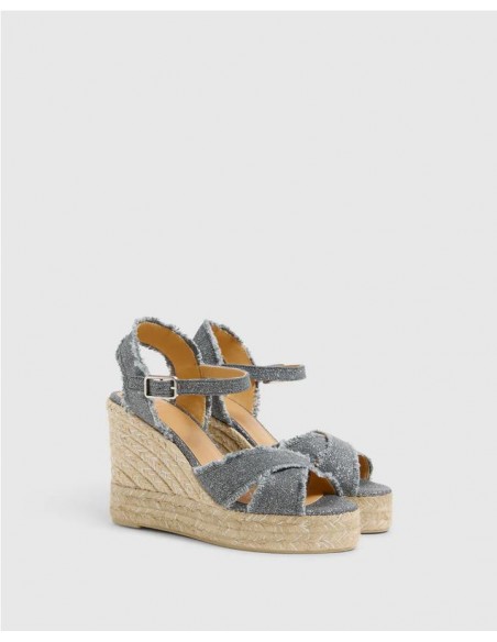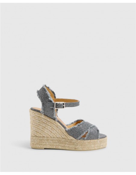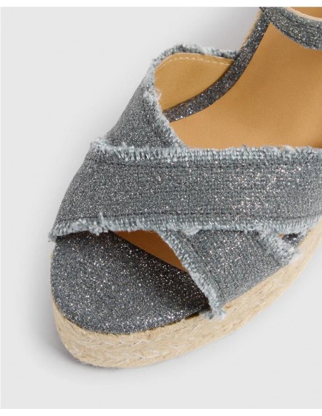 Alpargata estilo sandalia elaborada en lino metalizado. Plantilla forrada en cuero y acolchada. Tiene una altura total de 11 cm incluyendo 3 cm de plataforma. Es un modelo totalmente versátil para vestidos y pantalones.
