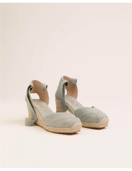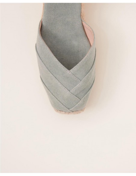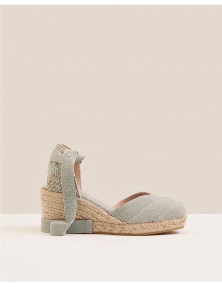 Alpargata elaborada en pique algodón de corte cerrado en forma de espiga y talonera con cierre mediante cintas anudadas al tobillo. Plantillas acolchadas y cuña de yute ecológico de 7,3 cm de altura y plataforma de 2 cm. Fondo de armario para tus salidas de verano.