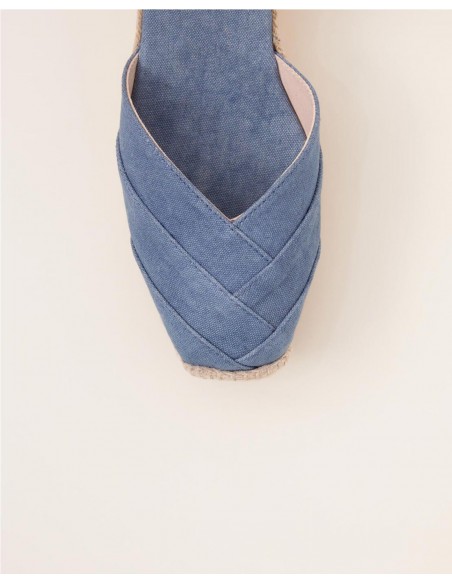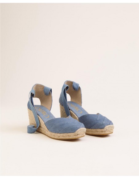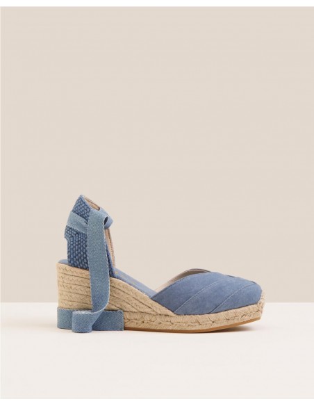 Alpargata elaborada en pique algodón de corte cerrado en forma de espiga y talonera con cierre mediante cintas anudadas al tobillo. Plantillas acolchadas y cuña de yute ecológico de 7,3 cm de altura y plataforma de 2 cm. Fondo de armario para tus salidas de verano.