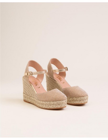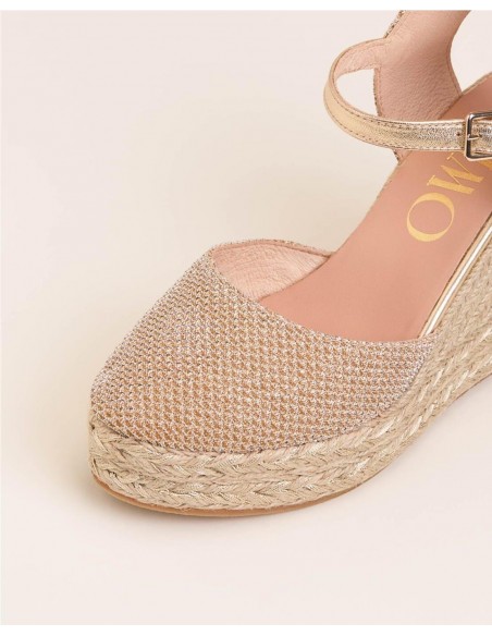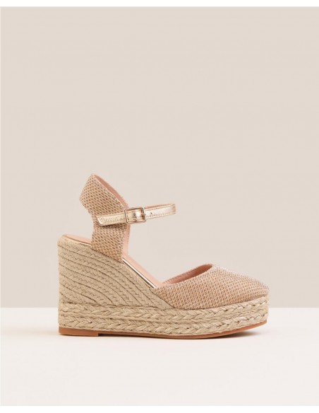 Valenciana en tejido rejilla metalizado de corte cerrado y talón abierto en piel con pulsera con hebilla lateral. Forro y plantillas acolchadas de piel con cuña de yute ecológico de 9,5 cm de altura y plataforma de 2,5 cm. Ideales para dar un toque sofisticado a tus looks.