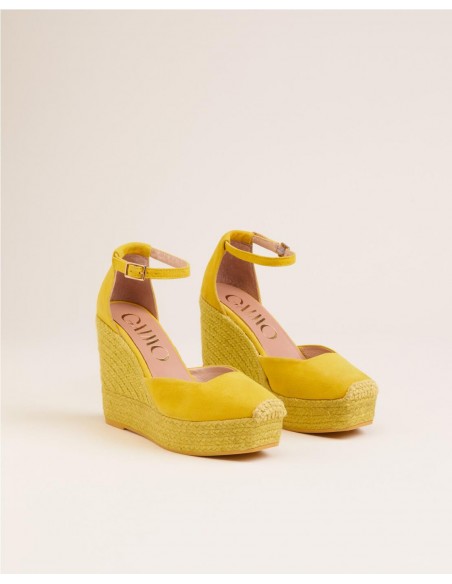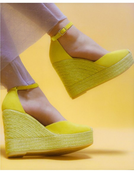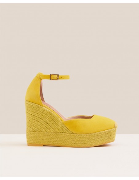 Valenciana elaborada en ante con escote cuadrado, corte y talón cerrado con cierre mediante pulsera con hebilla. Forro y plantillas acolchadas de piel con cuña tintada del mismo color en yute ecológico de 12,5 cm de altura y plataforma de 4 cm. Tienen un diseño cómodo y sofisticado para combinar con tus looks de verano.