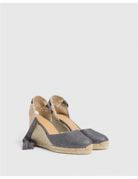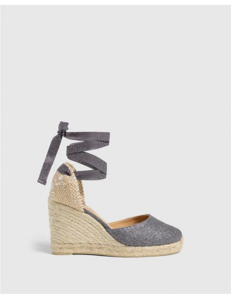 VALENCIANA ELABORADA EN LINO NATURAL CON ACABADO METALIZADO, ES EL MODELO CARINA. TIENEN PUNTERA CERRADA REDONDEADA, CIERRE MEDIANTE LAZADA, CUÑA DE 7CM Y SUELA DE CAUCHO VULCANIZADO. ALTURA TOTAL DE 9 CM INCLUYENDO LA BASE DE 2 CM. EL MODELO ICÓNICO DE CASTAÑER. UN FONDO DE ARMARIO IMPRESCINDIBLE Y ATEMPORAL.