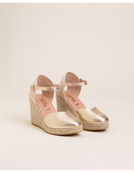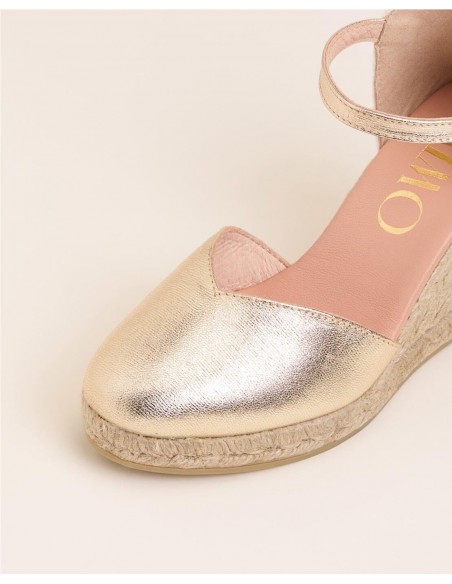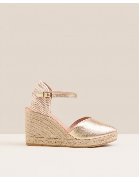 Alpargata en piel grabada de corte cerrado con escote corazón y talonera con cierre mediante hebilla al tobillo. Forro y plantillas acolchadas de piel con cuña de yute ecológico de 9 cm de altura y plataforma de 1,6 cm. Diseñadas y fabricadas artesanalmente en España, un modelo atemporal muy cómodo y sofisticado que podrás combinar con cualquiera de tus looks veraniegos.