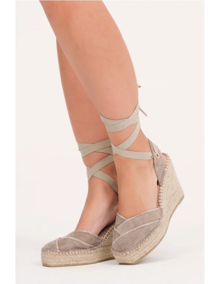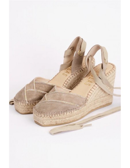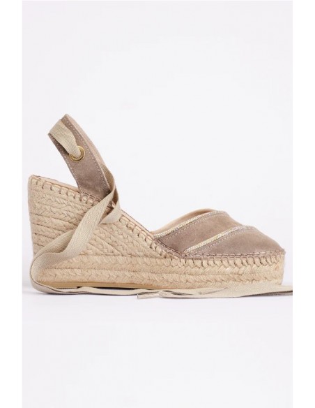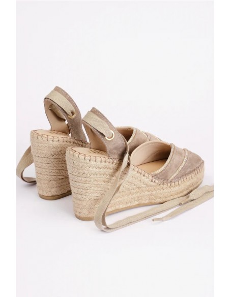 Valenciana cerrada de cuña alta con puntera cuadrada y escote en forma de corazón con cintas brillantes. Está elaborada en serraje con cintas beige para atar al tobillo. Piso de yute natural de 10 cm de altura, de los cuales 6.5 cm corresponden a la cuña y 3.5 cm a la plataforma. Son unas alpargatas muy cómodas y ligeras, con suela antideslizante. Fondo de armario para todos tus looks de verano.