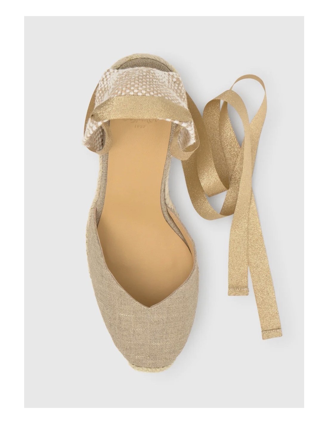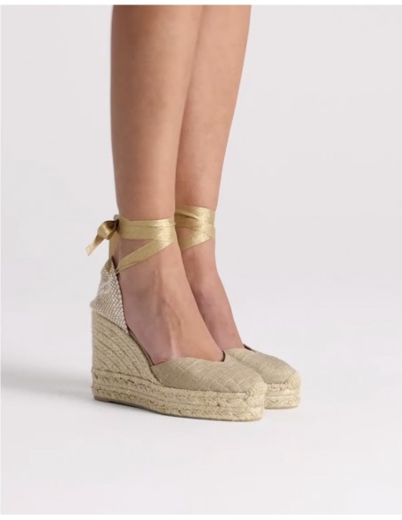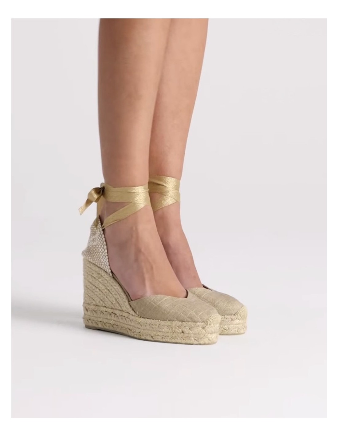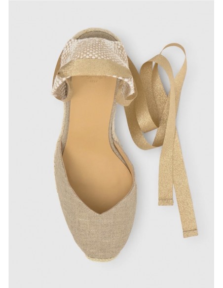 Icónica alpargata en lino metalizado, cierre con cintas y escote en V. Interior y plantilla forrado en piel y acolchado. Altura total de 11 cm incluyendo 3 cm de plataforma.