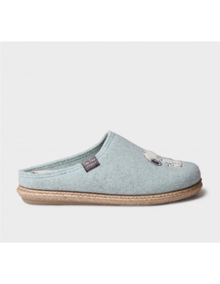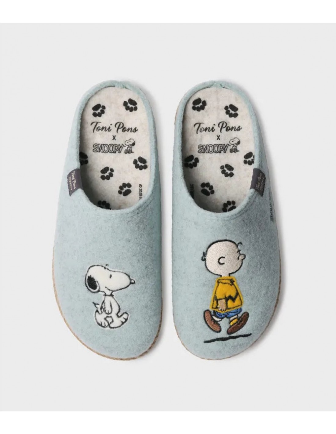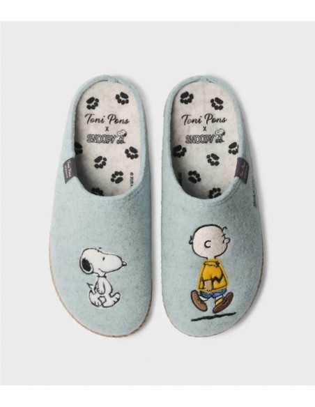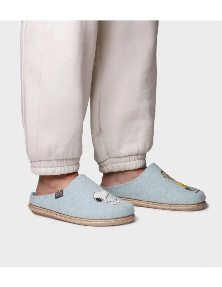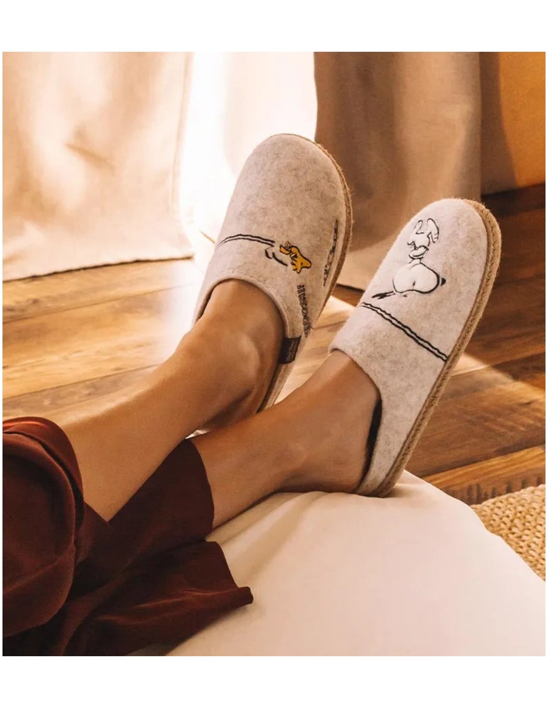 Slippers tipo zueco para mujer confeccionadas en fieltro que lucen en la pala los entrañables personajes de Snoopy. La suela es plana, con un grosor de 2 cm, y combina goma con trenza de yute para un acabado original y desenfadado. Incorporan una plantilla extraíble con una cuña de 2,5 cm en el talón, forrada en tejido para mayor confort. La base de la suela es de goma antideslizante, lo que garantiza una pisada segura.