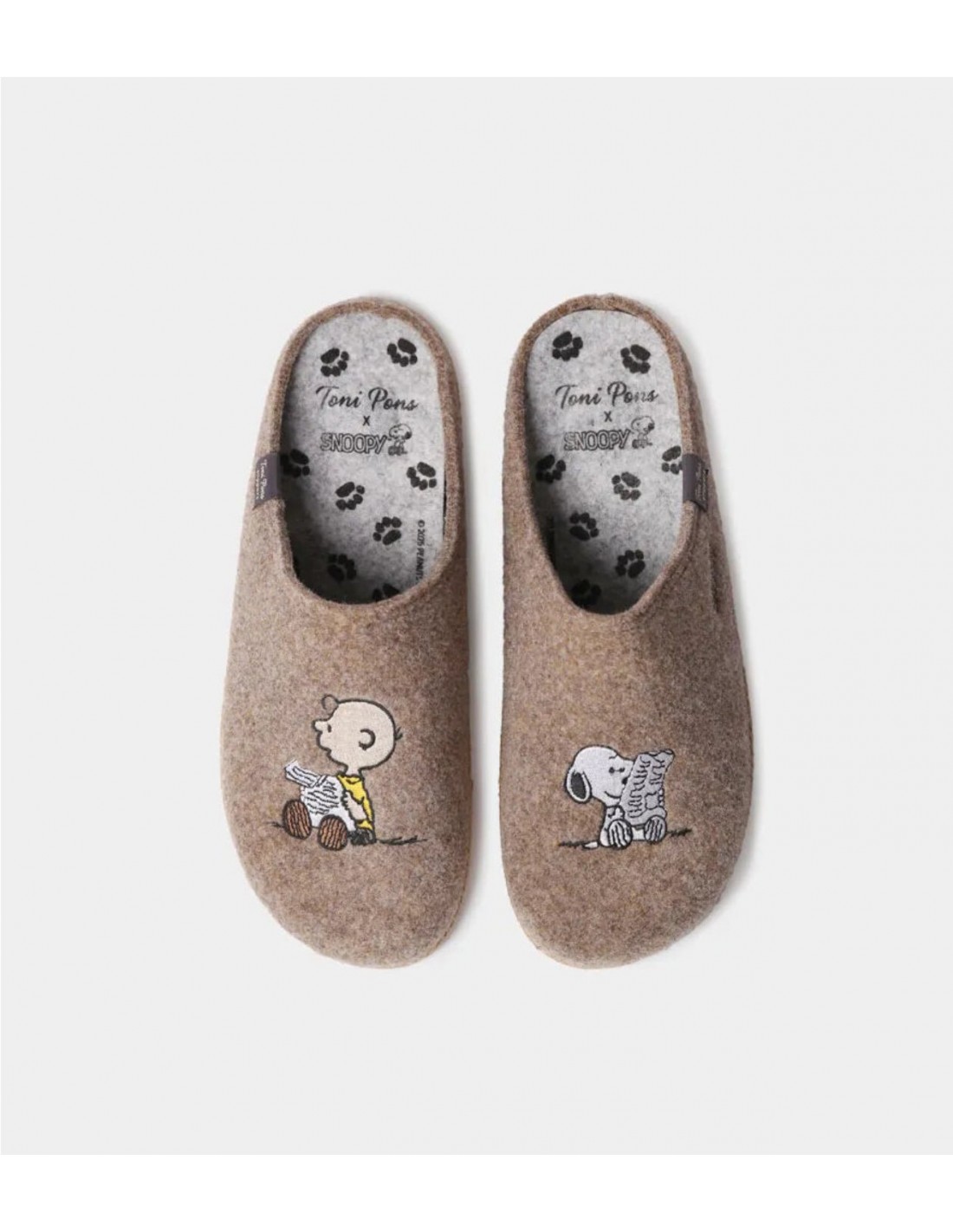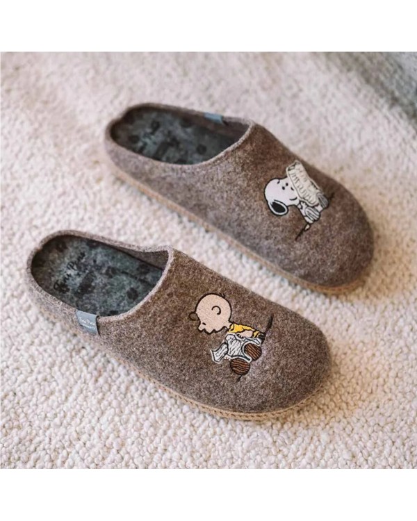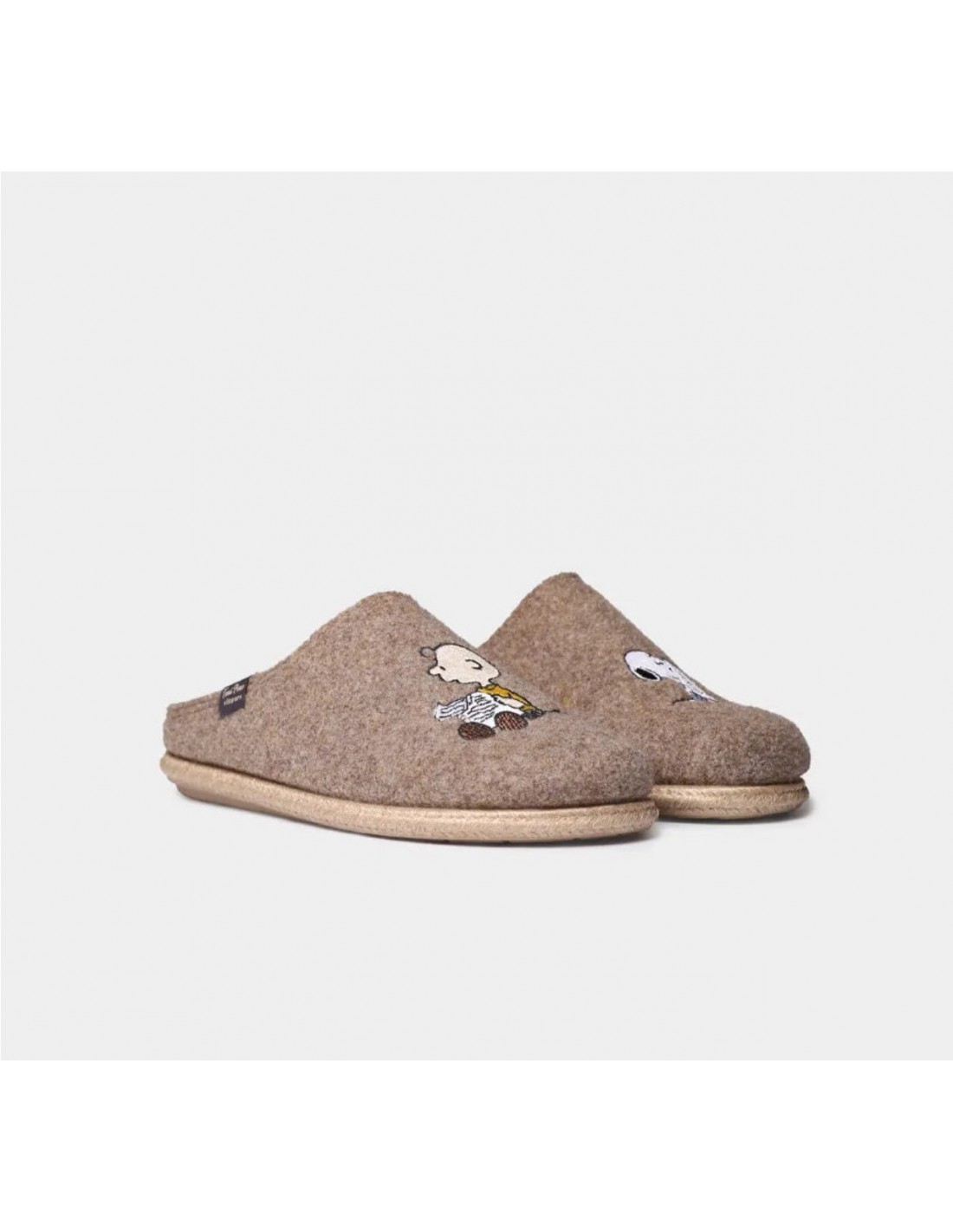 Slippers tipo zueco para hombre confeccionadas en fieltro que lucen en la pala los entrañables personajes Snoopy y Charlie Brown. La suela es plana, con un grosor de 2 cm, y combina goma con trenza de yute para un acabado original y desenfadado. Incorporan una plantilla extraíble con una cuña de 2,5 cm en el talón, forrada en tejido para mayor confort. La base de la suela es de goma antideslizante, lo que garantiza una pisada segura.